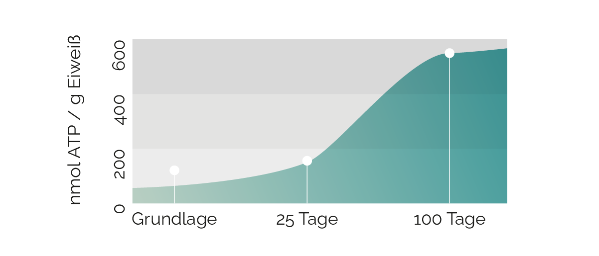 Direkter proportionaler Anstieg der ATP-Produktion auf zellulärer Ebene durch die Exposition gegenüber dem Biow-System. Äußerst signifikatischer Sprung nach 100 Tagen.