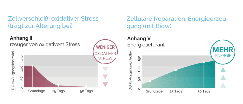 Das Biow-System erzeugt eine Umgebung, welche die zelluläre Aktivität unterstützt, indem es die mitochondriale Kapazität, die Proteinsynthese und die antioxidative Aktivität steigert.